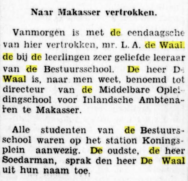 Twee dagen voor zijn huwelijk ontving L.A. de Waal de Resolutie van het Ministerie van Koloniën, dat hij ter beschikking werd gesteld van de Gouverneur Generaal om in rechterlijke betrekking daar te landen te functioneren.