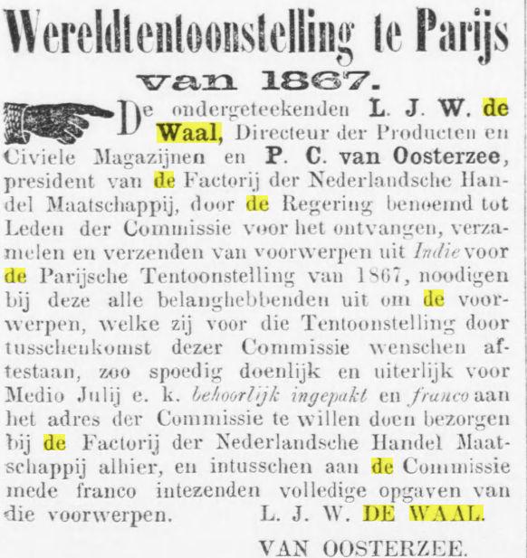 Als directeur van Producten en Civiele magazijnen werd Léonard Johannes Willem op 15-5-1866 belast als Comitélid met de organisatie van het verzamelen en verzenden van Indische voorwerpen ten behoeve van de Wereldtentoonstelling in Parijs van 1867.