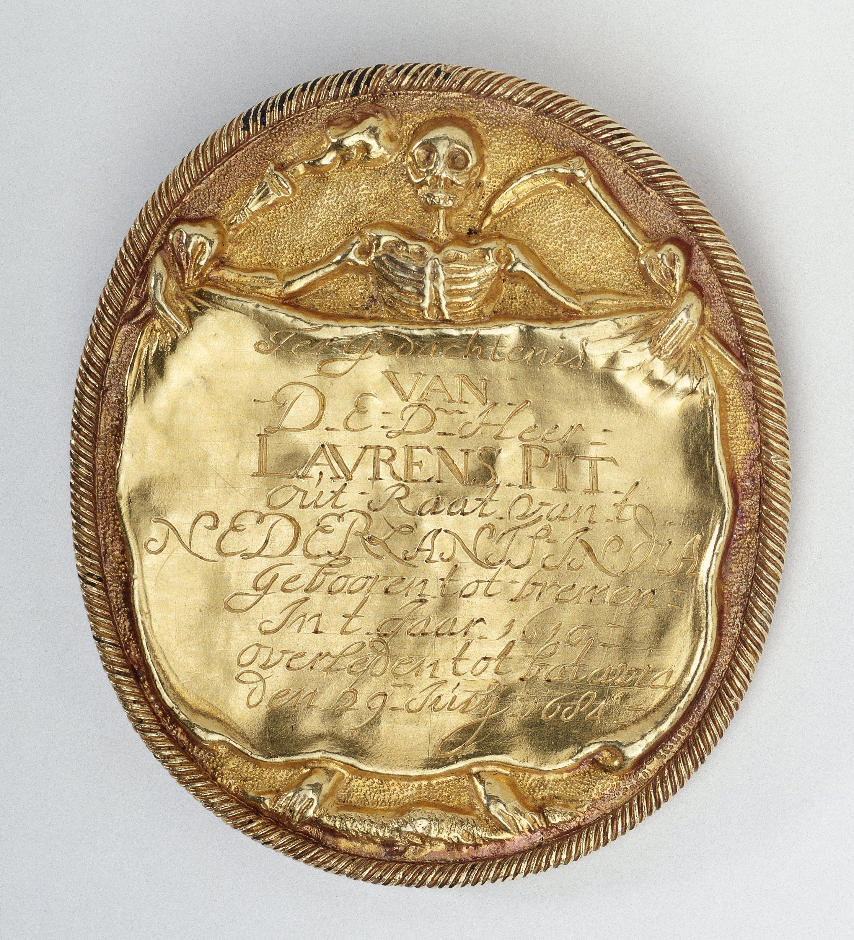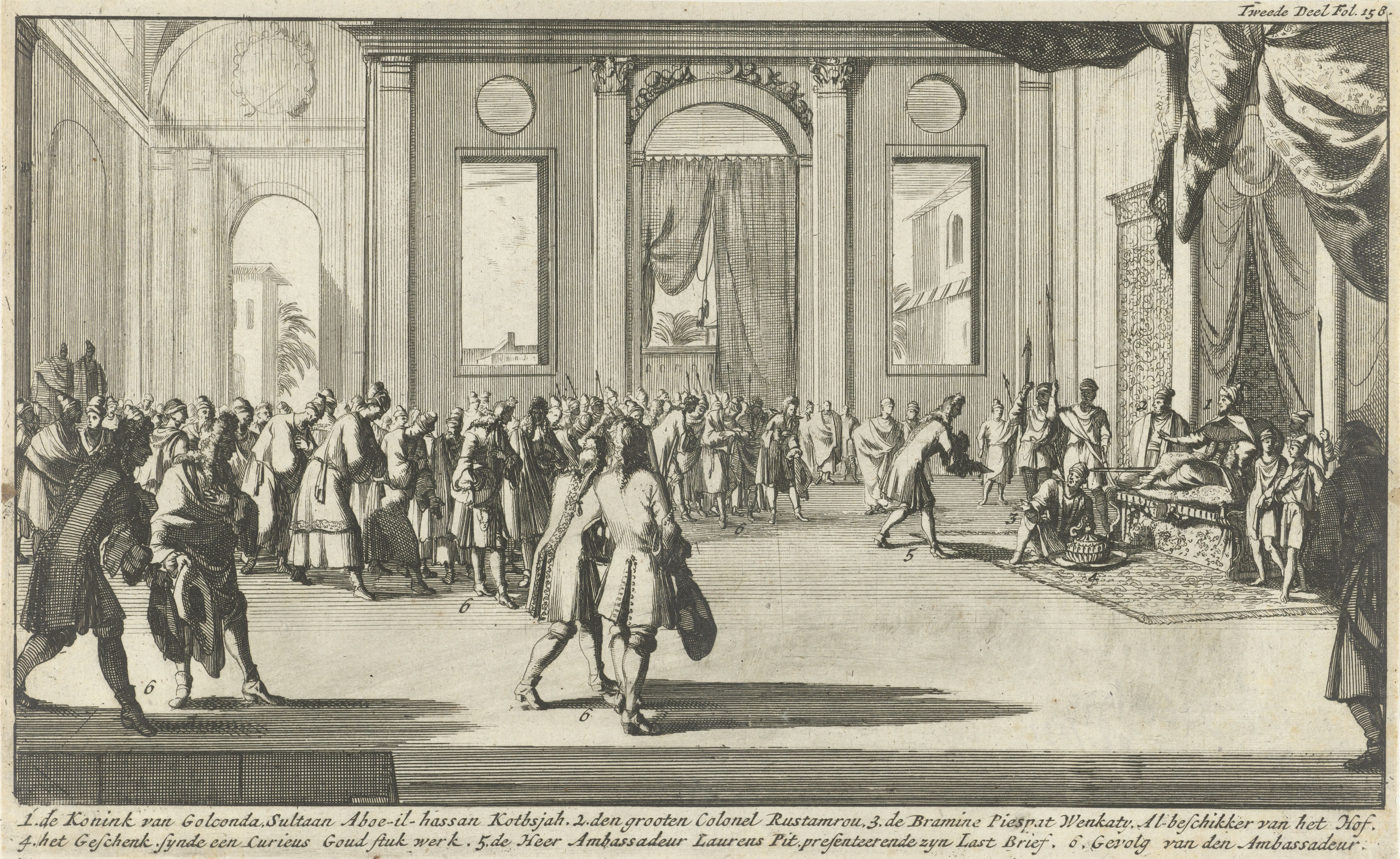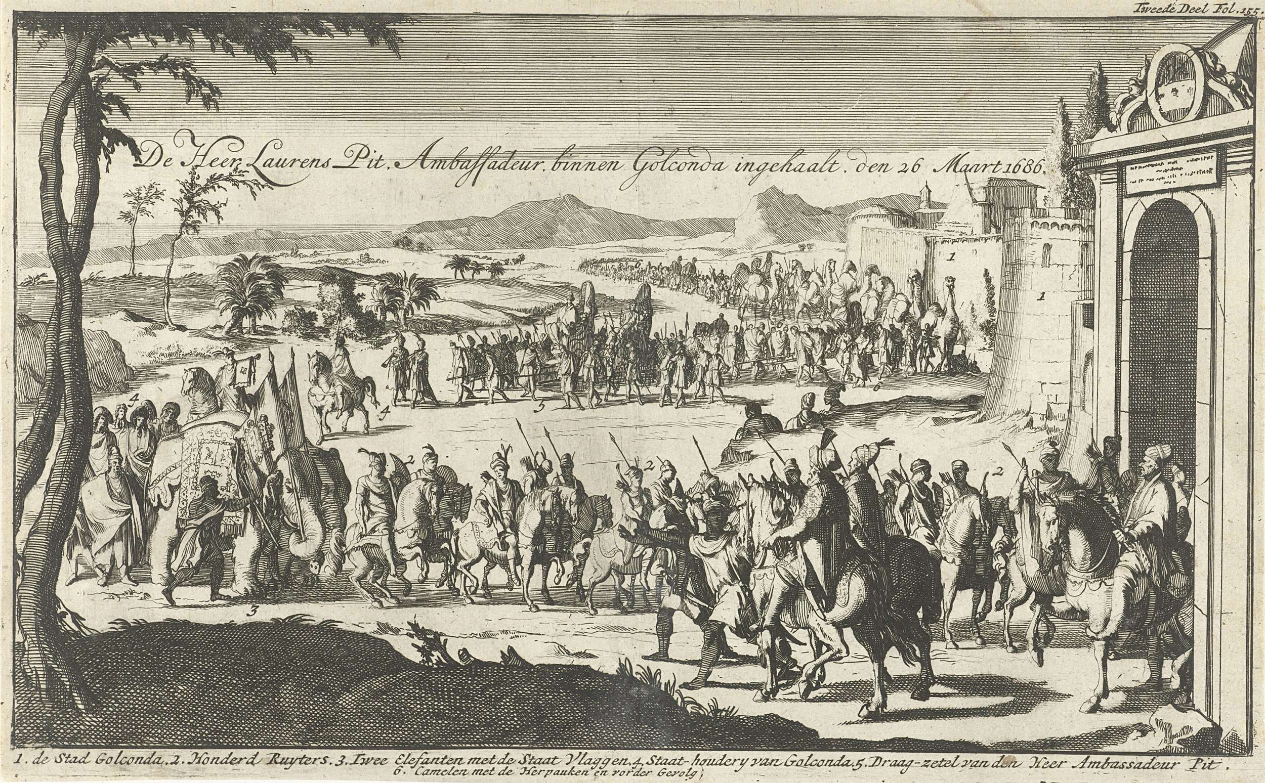 III.3        Laurens Pit (de Oude), geb. 1610 te Bremen, overl. 29 Juni 1684 te Batavia, zoon van Laurens Pit Johansz., afkomstig van Middelburg. Hij was eerst assistent in Ned. Indië, waarna hij als onderkoopman en fiscaal van de vloot te Middelburg kwam; ging daarna als opperkoopman voor de Kamer Amsterdam opnieuw naar Indië. Hij was in 1637 met zijne jachten tegenwoordig bij het sluiten van den vrede tusschen de Compagnie en den koning van Makassar. 7 Mei 1641 als opperkoopman geplaatst in den Raad van Justitie te Batavia. Gouverneur Laurens Pit bij Koning GolcondaWerd vervolgens kassier op Formosa, in Aug. 1642 opperkoopman te Palicatta (kust Coromandel), 1650 voorzitter op Coromandel, 1651 landvoogd op Mazulipatnam (N. Coromandel), 12 April 1652 gouverneur op Coromandel, 1657 extra-ordinaris raad van Indië. Beraamt 1661 met den commissaris Ryklof van Goens en den gouverneur van Ceylon een aanslag van uit de kust Coromandel op de Portugeezen te St. Thomé, Gouverneur Laurens Pit Golkondavan welke expeditie door toedoen van den Koning van Golconda niets gekomen is. Wordt medio 1661 benoemd tot ordinaris raad van Indië, doch moet voorloopig nog in zijn gouvernement blijven. 25 Juni 1663 geeft hij het bestuur op Coromandel over aan Cornelis Speelmən en neemt 7 Sept. d.a.v. zitting in den genoemden Raad, waarin hij bleef, tot hij volgens order der H.H. Zeventienen dd. 12 Apr. 1678 bedankt, gelicentieerd en van zijn charges ontslagen werd. Tusschen 1663 en 1678 zat hij te Batavia nog in onderscheiden commissiën, en was er o.a. kerkmeester van de Maleische Kerk en president-schepen (beide in 1665).
